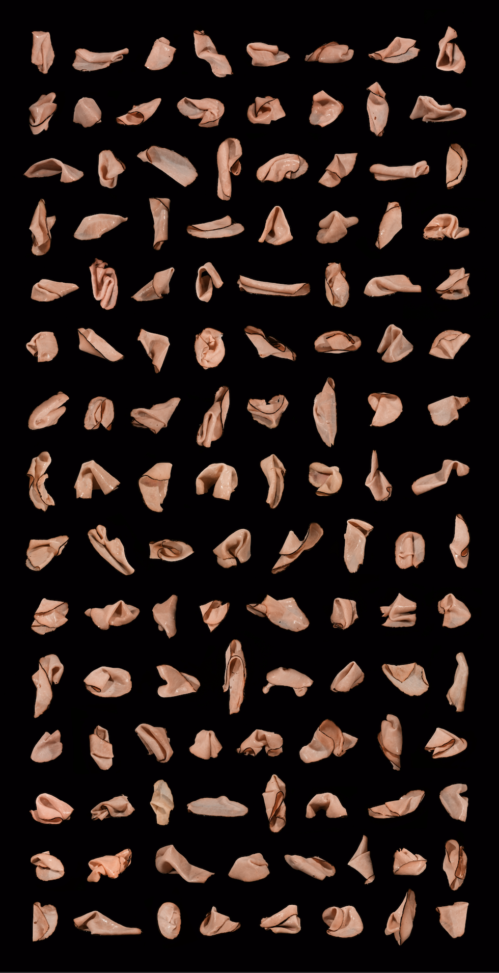 Weber: I studied printmaking. Lithography. Then in grad school I moved into digital work, which incorporated photography and video. One of the things you do in printmaking is you think about things in layers, and also sequencing. And because you can make multiple prints from one, you usually work in a series. I think my work still has this layering aspect. And I don’t know why I would do this, but I would take ham into the bathroom on my breaks and I would mask my face with ham. And take these selfies. And so I’m not just going to make one meat smiley. I’m going to make a lot of them.